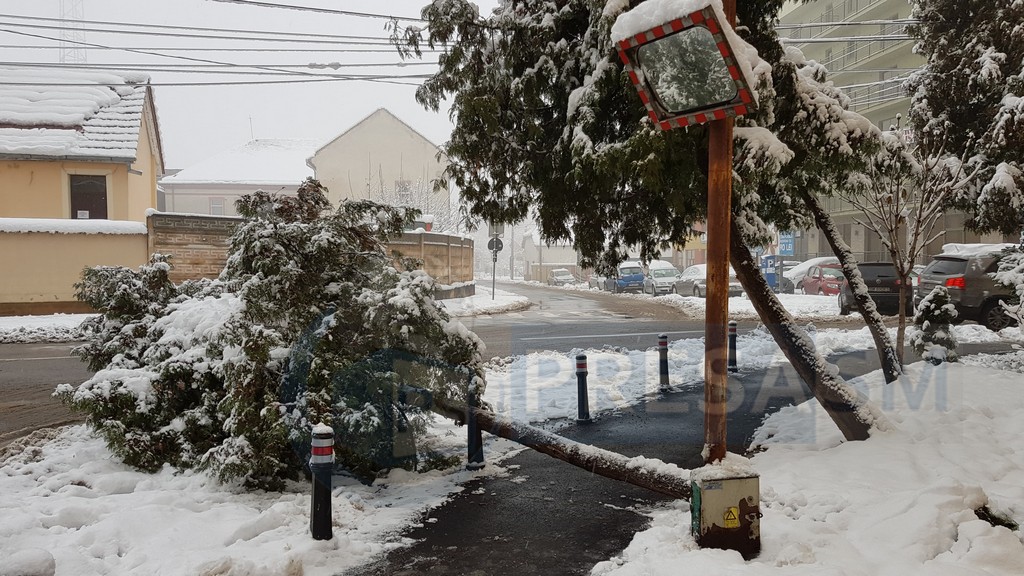 5. Copac căzut peste un autoturism pe strada Albumului, colț cu strada Ganea, în Cartierul Carpați din municipiul Satu Mare.