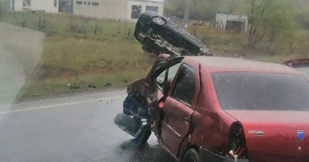 În schimb, autoturismul Dacia Logan a rămas pe partea carosabilă, dar a fost avariat destul de serios în partea stângă lateral-față. Din câte se pare, niciunul dintre șoferi nu a fost rănit grav, iar șoferul Mercedes-ului ar fi reușit să iasă singur din autoturism.