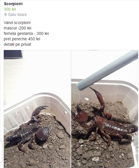 ”Vând scorpioni. Mascul – 200 lei. Femelă gestantă – 300 lei. Preț pereche – 450 lei”, se arată în anunțul postat de sătmărean.