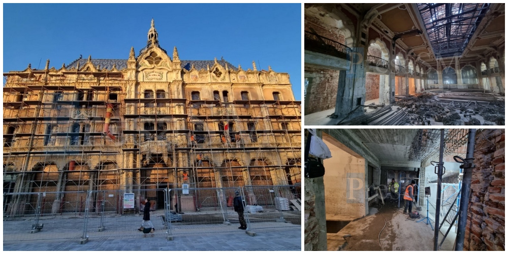 Lucrările în interiorul clădirii sunt destul de avansate. Doar oglinda mare de pe peretele sălii de bal și sistemul de iluminat natural mai aduc aminte de ceea ce a fost odată Hotelul Dacia. Peste tot, tencuiala a fost îndepărtată până la cărămidă. Elementele de decor sunt ancorate cu scripeți metalici, astfel încât să nu se prăbușească. Tabloul este completat de panourile de lemn care blochează geamurile, protecție în fața intemperiilor.