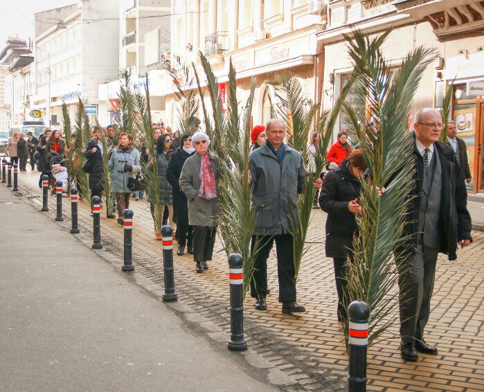 De duminica floriilor în centrul municipiului Satu Mare au defilat membrii comunităţii neocatecumenale cântând în limba română respectiv maghiară cântece bisericeşti despre gloria şi patimile lui Isus.