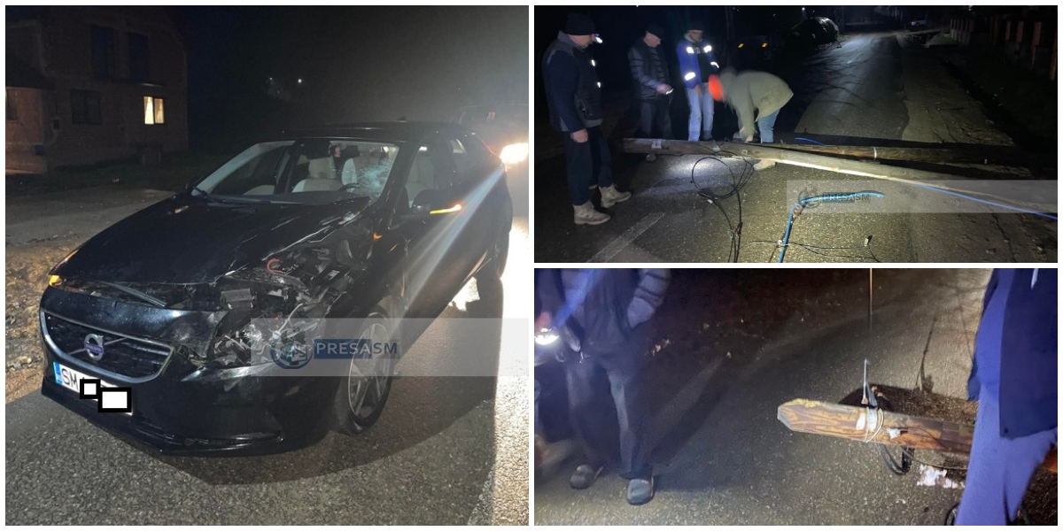 Conform informațiilor PresaSM, mașina era condusă pe șosea, regulamentar, moment în care un stâlp de lemn care susține firele de telecomunicații a cedat, pur și simplu, și a căzut peste autoturism.