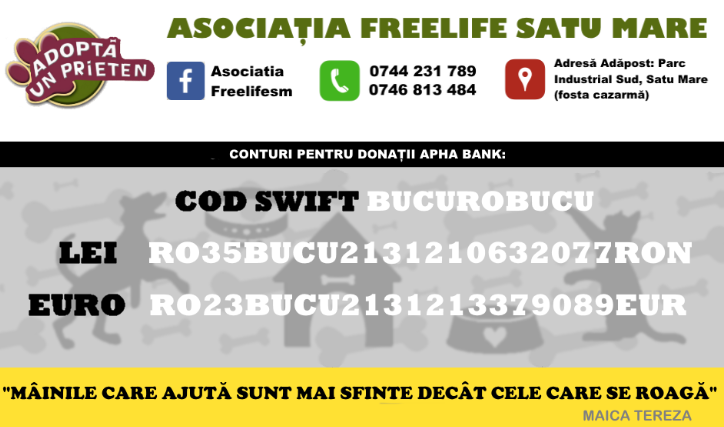 ”Din nou vești rele, munca zilnică în adăpost nu este deloc ușoară, suntem epuizati la maxim. Din păcate, în urma accidentului deplasările pe teren, capturări, drumuri la cabinetele veterinare sunt mai puține, vom folosi pentru urgențe mașinile mici. Din fericire, noi suntem bine, doar unul din pasageri a fost rănit ( superficial), iar cea mai utilă mașină a adăpostului a fost distrusă. Din păcate, de data aceasta nu o mai putem repara, vă rugăm ajutați-ne, trebuie să ne mobilizăm pentru a reuși să achiziționăm una cât de curând posibil. Mâncarea pufoșilor este indispensabilă, sterilizări, urgențe, fără dubă suntem fără mâini. Mulțumim pentru înțelegere”, este apelul celor de la FreeLife.