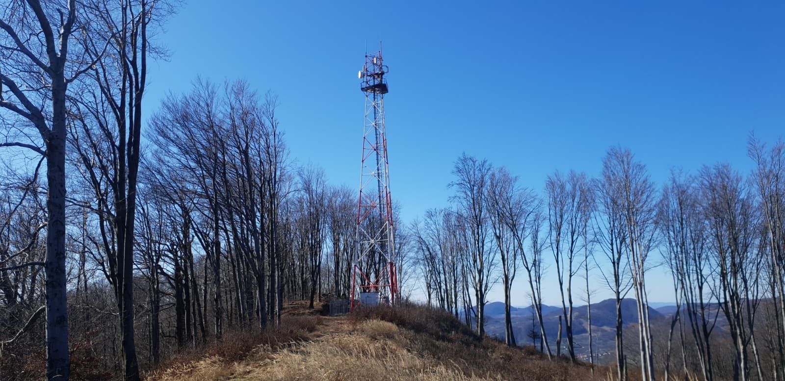 Pornim de la mașină și reperăm destinația drumeției: Vârful Bârloagele, scăldat în soarele primăverii și omniprezentul releu.