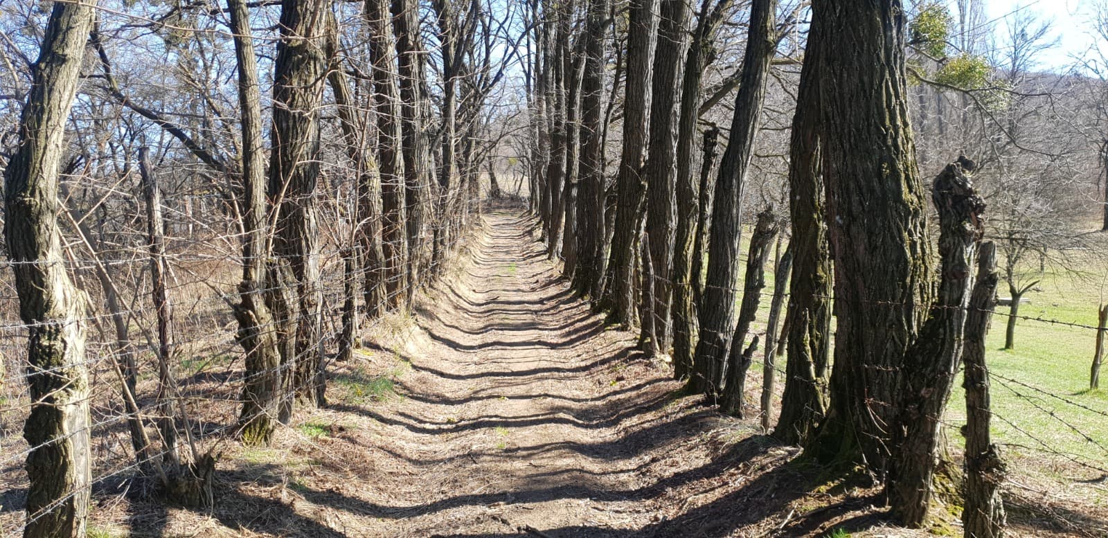 După circa un kilometru parcurs, trecând printre ogrăzi și câteva case presărate, traseul ne rezervă prima surpriză placută, (denumită de noi Aleea timpului ce stă în loc) o alee împrejmuită cu salcâmi bătrâni, care stârnește în noi dorința de a nu mai pleca din acel loc și a rămâne acolo să contemplăm în melancolie, așteptând umbra deasă din zilele calde și mireasma dulce a florilor de salcâm.