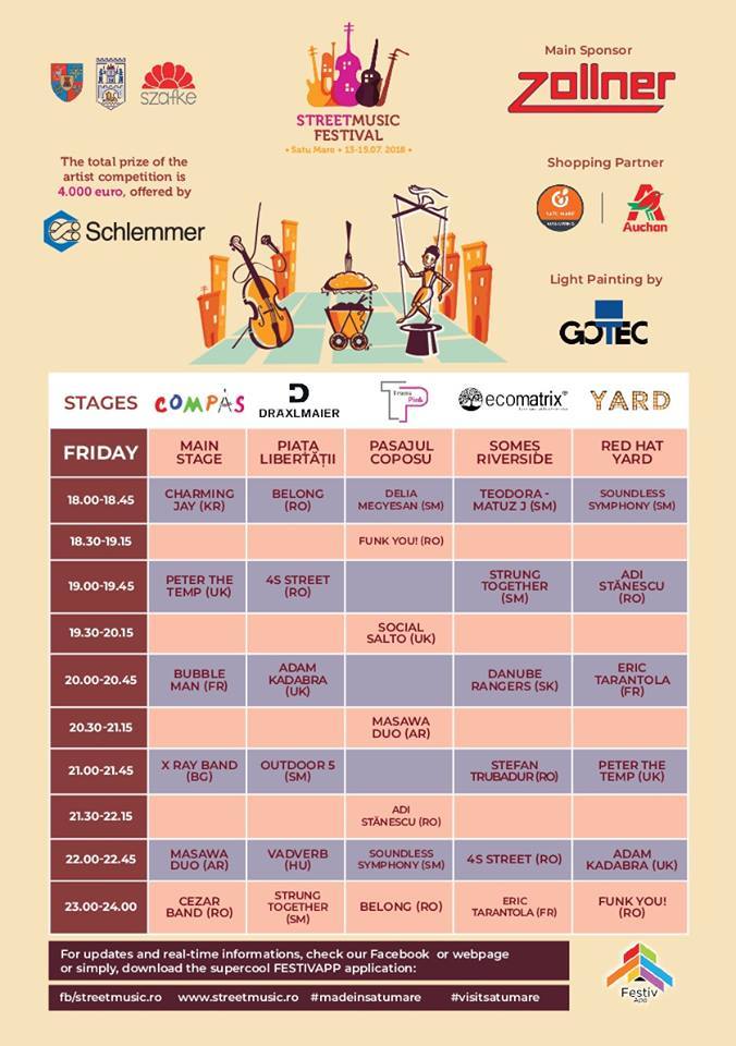 Așadar, de vineri, 13 iulie,după-amiaza, până duminică seara satmarenii sunt asteptati la noi experiențe cu muzicieni, acrobați, jongleri, street food și alte senzații, la StreetMusic Festival.