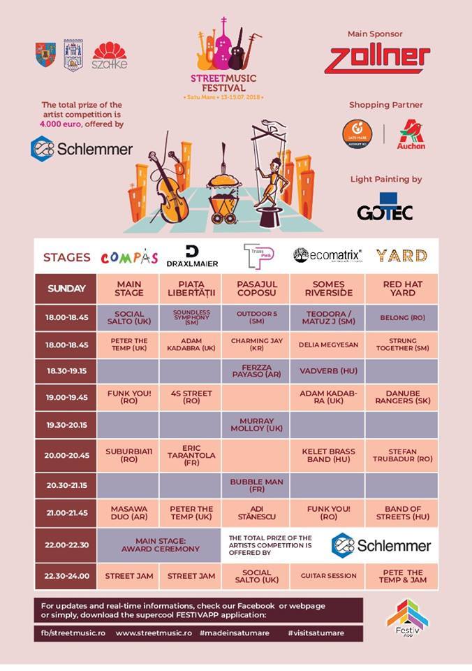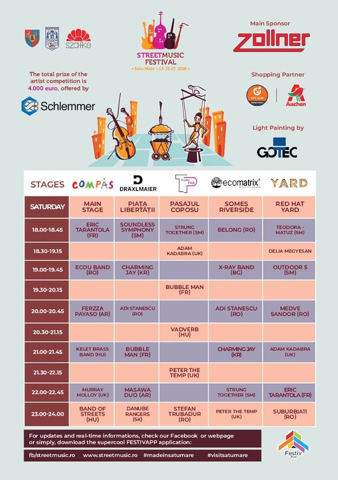 La evenimentul din acest week-end vor urca pe scene un număr de 25 de artiști, din care 10 sunt din străinătate. Printre artiști se numără muzicieni, jongleri și magicieni, trupe din România și bineînțeles, tinerii talenți din Satu Mare. Ca în fiecare an, se va derula un concurs internațional printre artiștii prezenți.
