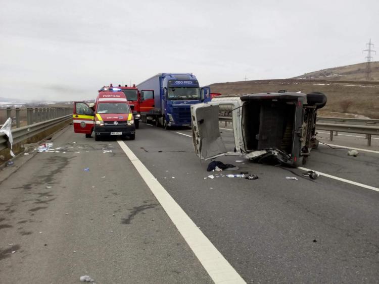 Cel puţin cinci persoane au fost rănite, luni, şi primesc îngrijiri medicale după ce un TIR şi un microbuz s-au ciocnit pe Autostrada Gilău – Turda. Microbuzul cu pasageri s-a răsturnat, iar traficul pe sensul către Turda a fost blocat.