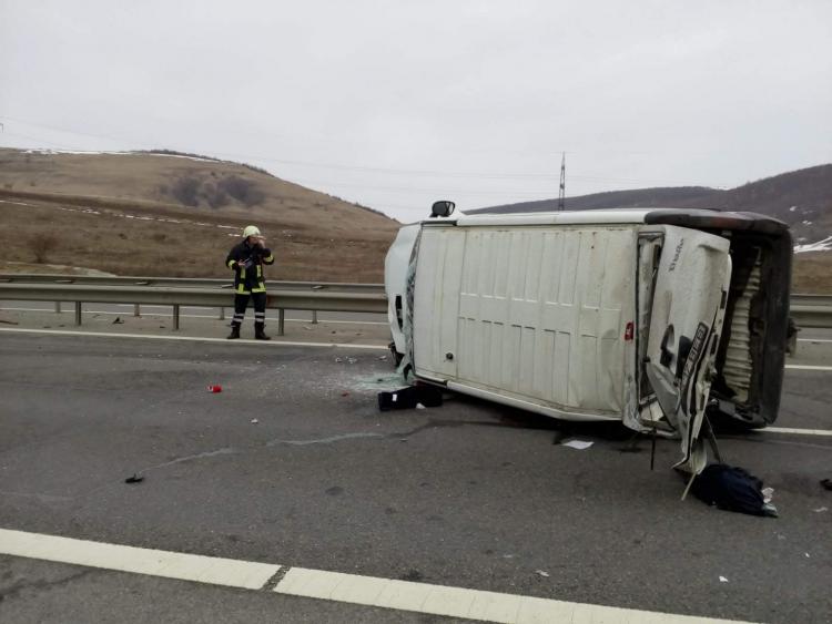 ”În urma impactului,microbuzul s-a răsturnat pe carosabil. Circulaţia rutieră este oprită”, a transmis Infotrafic.