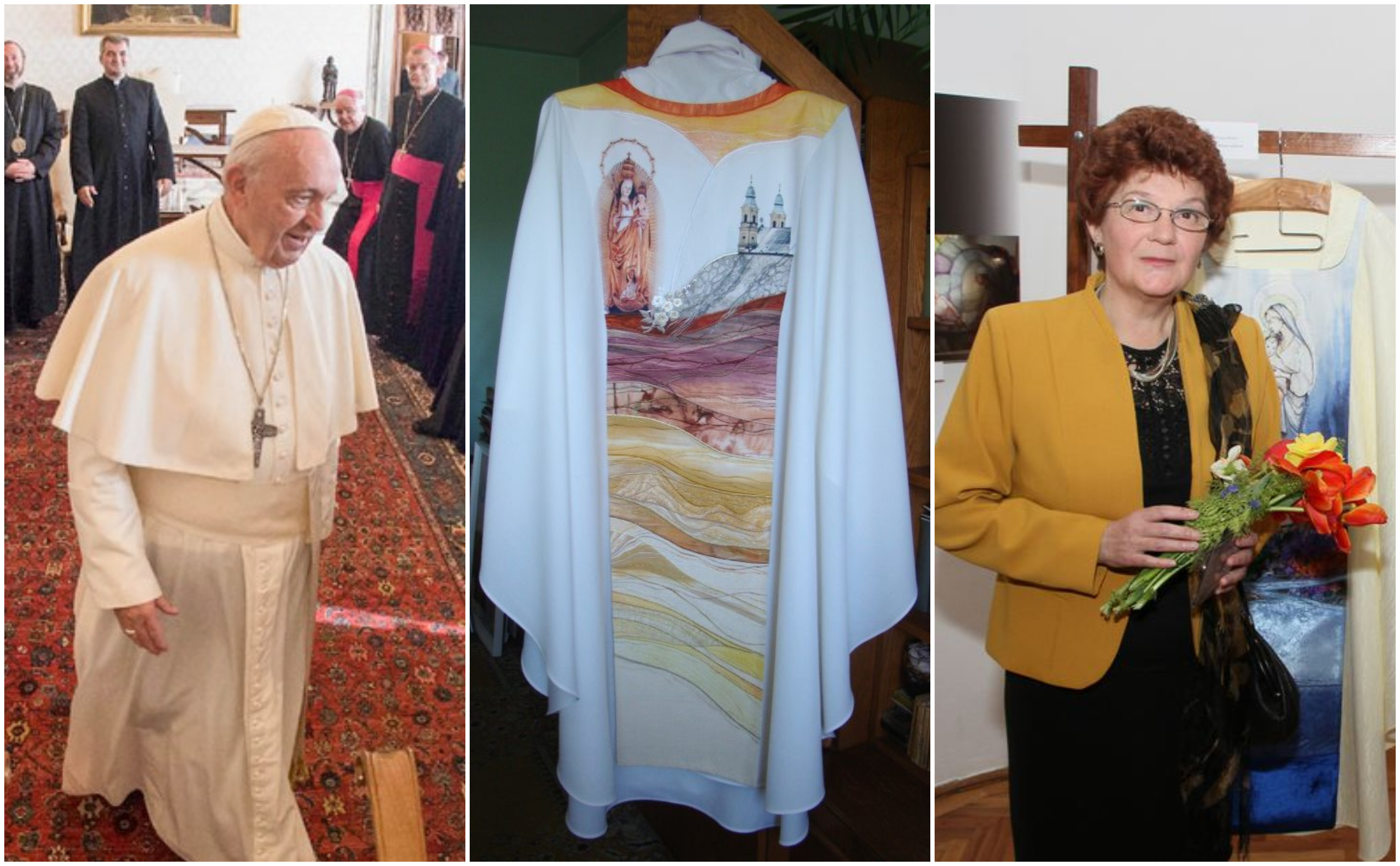Suveranul Pontif a ajuns astăzi într-o vizită istorică în România, care va dura până în 2 iunie. Evenimentul central este programat la Șumuleu Ciuc, unde va oficia Sfânta Liturghie, pe data de 1 iunie. Hainele pe care Papa Francisc le va purta la Șumuleu Ciuc au fost realizate de către artista sătmăreană Sabău Trifu Cristina.