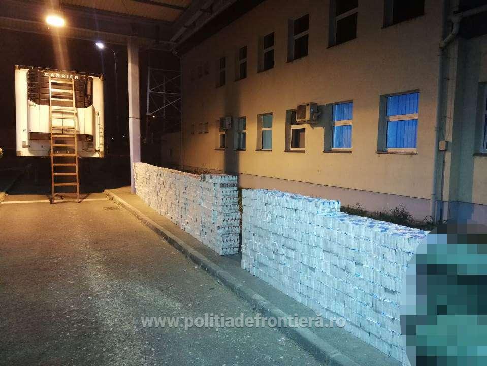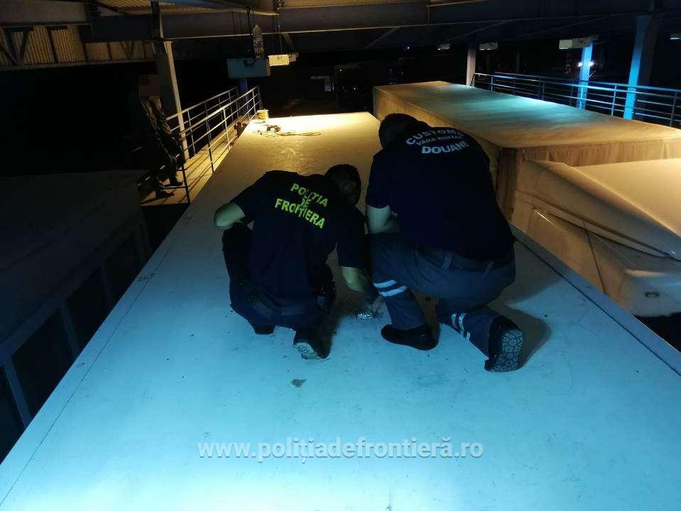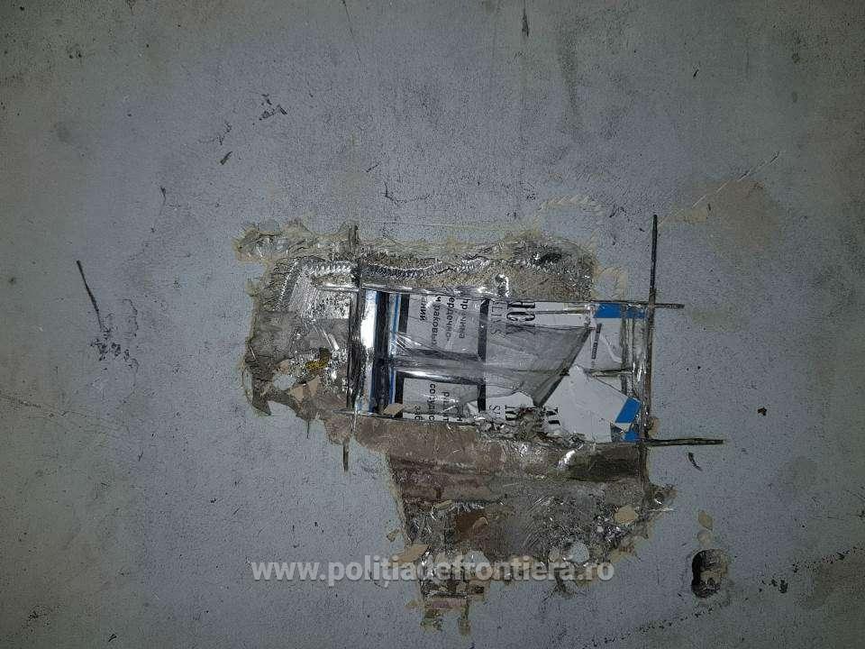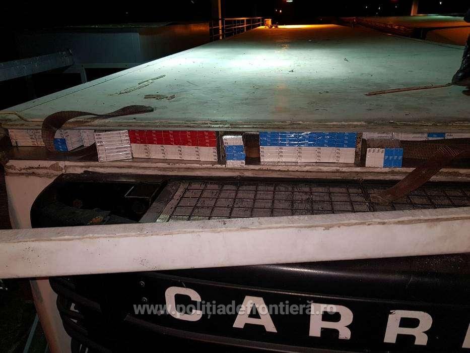 Astfel, a fost descoperită ascunsă şi nedeclarată, în vederea sustragerii de la controlul vamal, într-un spațiu special amenajat în plafonul semiremorcii, o cantitate mare de țigări.