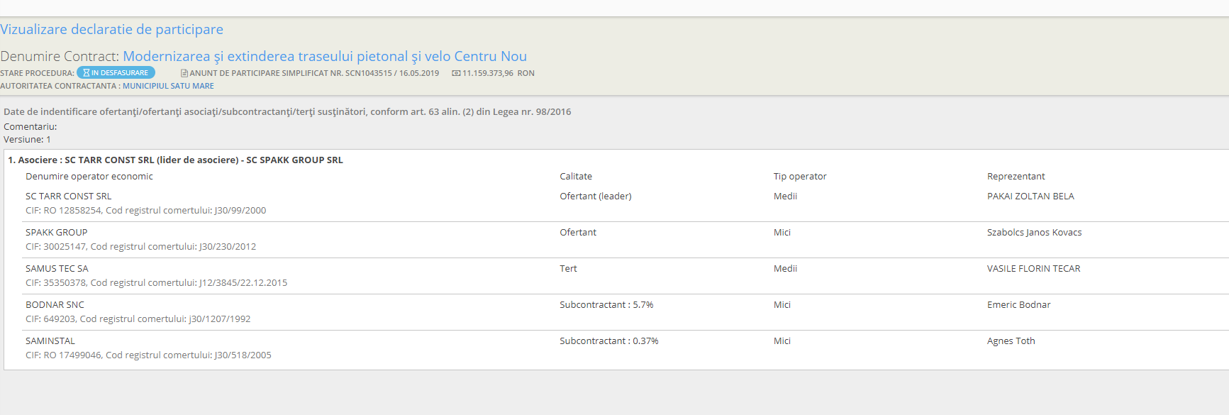 O asociere de firme sătmărene a depus o ofertă în vederea accesării lucrărilor de reamenajare și reabilitare a Centrului Nou din municipiul Satu Mare. Este vorba despre asocierea dintre Tarr Const - lider de asociere, Spakk Group, Samus Tec, Bodnar SNC și Saminstal.