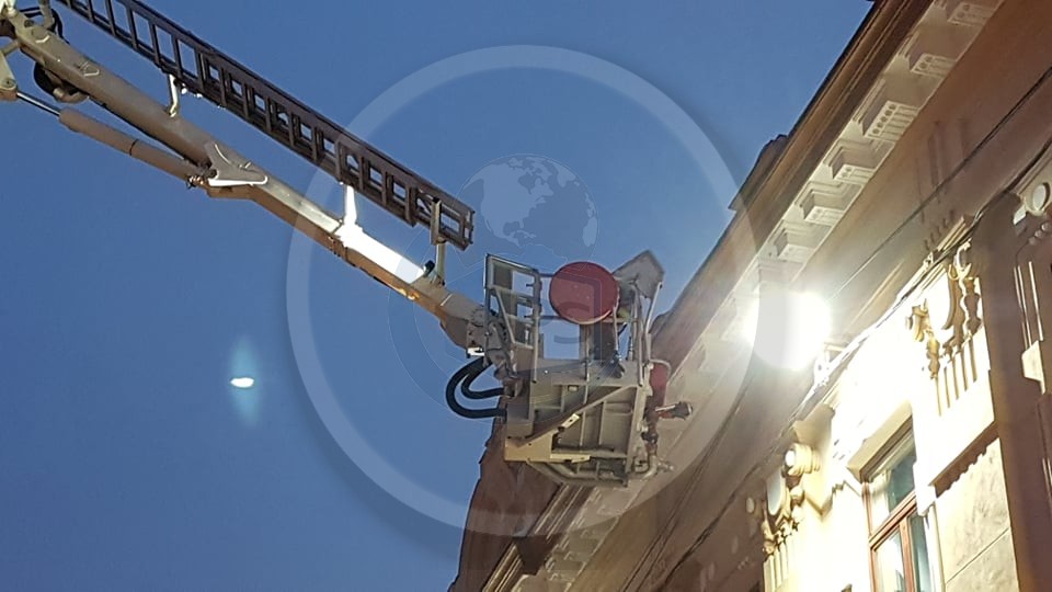 Intervenție a pompierilor duminică seara la sediul Poliției de pe strada Mihai Viteazul. A fost nevoie de autospeciala pentru intervenții la înălțime.