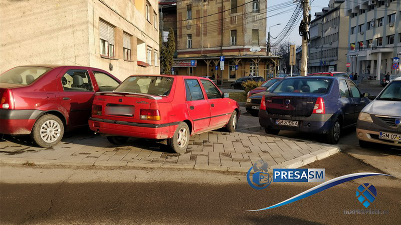 FOTO/VIDEO. Trotuar blocat de mașini în centrul Sătmarului! Pietonii au interzis