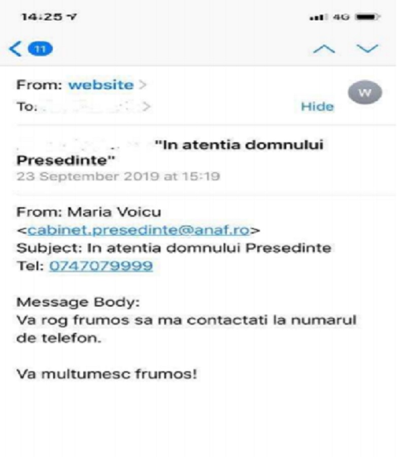 "Precizăm că, nu există vreo persoană cu numele Maria Voicu care să-și desfășoare activitatea la Cabinetul Președintelui. Pentru siguranța dumneavoastră, vă sfătuim să nu deschideți aceste emailuri, iar dacă au fost deschise, să nu urmați pașii descriși în acestea: să nu apelați numărul de telefon afișat/recomandat sau să dați Reply la email", avertizează cei de la ANAF.