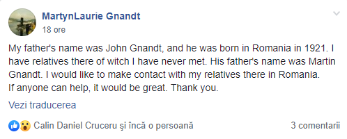 ”My father’s name was John Gnandt, and he was born in Romania in 1921. I have relatives there of witch I have never met. His father’s name was Martin Gnandt. I would like to make contact with my relatives there in Romania. If anyone can help, it would be great. Thank you”, este mesajul original postat de bărbat.