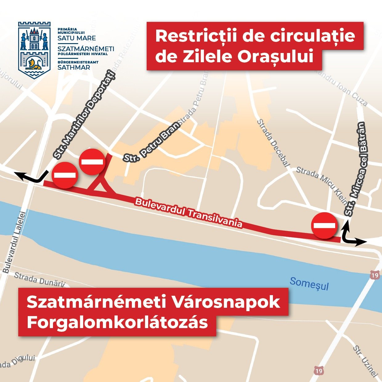 "Stimați sătmăreni pentru buna desfășurare a evenimentului Zilele Orașului Satu Mare, ediția 2022 , vă rugăm să țineți cont că începând din 26 mai, ora 20.00 și până luni, 30 mai, ora 06.00, pe Bulevardul Transilvania se vor aplica restricții de circulație, iar pe tronsonul închis circulației nu se va putea parca! Vă rugăm să consultați harta atașată. Vă mulțumim pentru înțelegere!", reamintesc autoritățile locale.