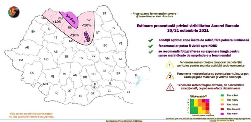 Există posibilitatea ca în această noapte Aurora Boreală sa fie vizibilă partial şi din Romania. Zonele vizate de posibila vizibilitate a fenomenului ar fi Maramures, Transilvania, Nordul Moldovei (judeţele Maramureş, Satu Mare, Bistrita Nasaud, Cluj, Mureş, Harghita, Suceava, Botoșani)