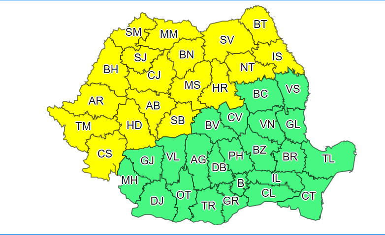 Specialiștii Administrației Naționale de Meteorologie au remis o avertizare de tipul COD GALBEN de vreme rea pentru județul Satu Mare, pentru intervalul 13 iunie, ora 02:00 – 13 iunie, ora 10:00.