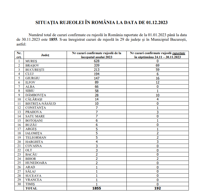 Autoritățile vorbeau de aproape 2.000 de cazuri la nivel național, în 29 de județe, înregistrate de la începutul lunii, în timp ce doar în ultima săptămână a lui noiembrie, potrivit datelor publicate de Centrul Național de Supraveghere și Control al Bolilor Transmisibile, s-au înregistrat 192 de cazuri noi. Cele mai multe cazuri, peste 1600, s-au înregistrat la copiii sub 1 an, arată sursa citată.