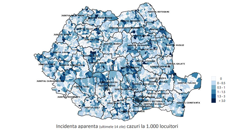INSP a prezentat noul raport cu privire la evoluția pandemiei de COVID-19 la nivelul județelor țării în perioada 28 septembrie – 4 octombrie. Autoritățile nu fac publice cifrele care arată incidența din fiecare localitate, dar harta Institutului Național arată că într-o singură comună din Satu Mare, în ultimele 14 zile, rata incidenței de infectare trece de trei cazuri la mia de locuitori. Este vorba despre focarul de la Turț.