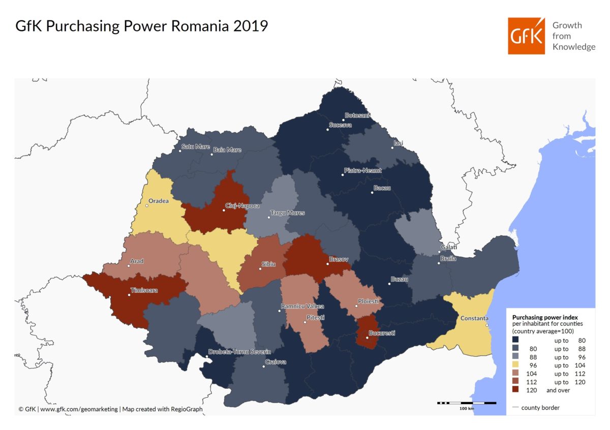București conduce în clasament, cu o putere de cumpărare medie pe cap de locuitor de 10.452 de euro. Această sumă echivalează cu 78% mai mulți bani decât în restul țării. La celălalt capăt al clasamentului se află județul Vaslui, cu o putere de cumpărare medie pe cap de locuitor de 3.706 de euro. Aceasta plasează Vasluiul cu aproximativ 37% sub media națională și cu aproximativ 75% sub media europeană, spun cei de la Gfk.
