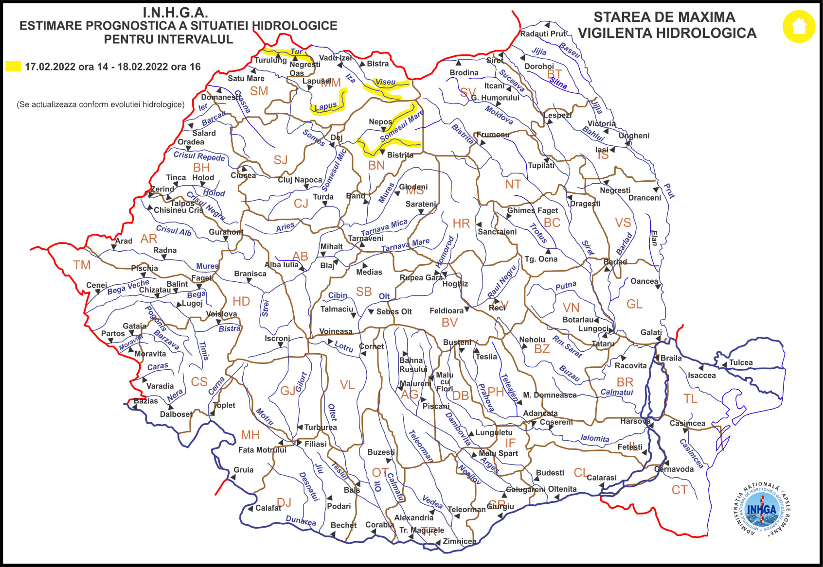 "Fenomenele hidrologice periculoase se pot produce cu probabilitate şi intensitate mai mare ȋn intervalul 17.02.2022 ora 16:00 – 18.02.2022 ora 09:00 pe unele râuri din bazinele hidrografice: Lăpuş – bazin superior şi afluenţi bazin mijlociu şi inferior (judeţul Maramureş), Tur – bazin superiȋor şi afluenţi bazin mijlociu şi inferior (judeţul Satu Mare)", precizează cei de la INHGA.