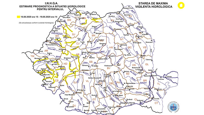 Având în vedere situaţia hidrometeorologică actuală şi prognoza meteorologică pentru următoarele 24 de ore, ca urmare a precipitaţiilor prognozate şi propagării se pot produce scurgeri importante pe versanţi, torenţi, pâraie, viituri rapide pe râurile mici cu posibile efecte de inundaţii locale, creşteri de debite şi niveluri cu posibile depăşiri ale COTELOR DE ATENŢIE, după cum urmează: În intervalul 18.08.2020 ora 15:00 – 19.08.2020 ora 14:00 pe râurile din bazinele hidrografice: Vişeu – bazin superior şi afluenţi bazin mijlociu şi inferior, Iza – bazin superior şi afluenţi bazin mijlociu şi inferior (judeţul Maramureş), Tur – bazin superior şi afluenţi bazin mijlociu şi inferior (judeţul Satu Mare), Someş – afluenţii mici aferenţi sectorului aval S.H. Dej (judeţele: Cluj, Sӑlaj, Maramureş şi Satu Mare), Someşul Mic – bazin superior şi afluenţi bazin mijlociu şi inferior (judeţele: Bihor şi Cluj), Crasna – bazin superior şi afluenţi bazin mijlociu şi inferior (judeţele: Sӑlaj şi Satu Mare).