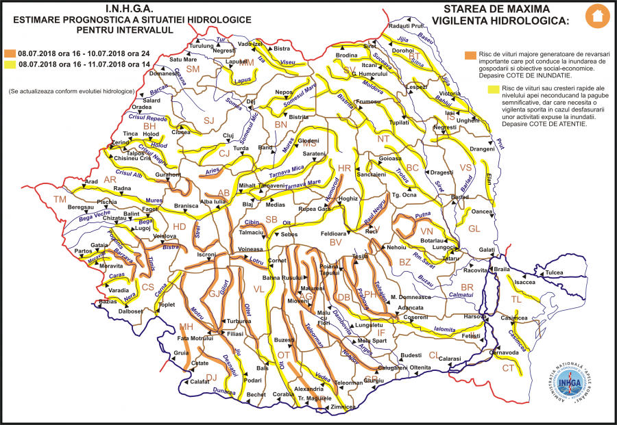 FENOMENELE VIZATE:Scurgeri importante pe versanţi, torenţi, pâraie, viituri rapide pe râurile mici cu posibile efecte severe de inundaţii locale şi creşteri rapide de debite şi niveluri cu posibile depășiri ale COTELOR DE INUNDAȚIE.