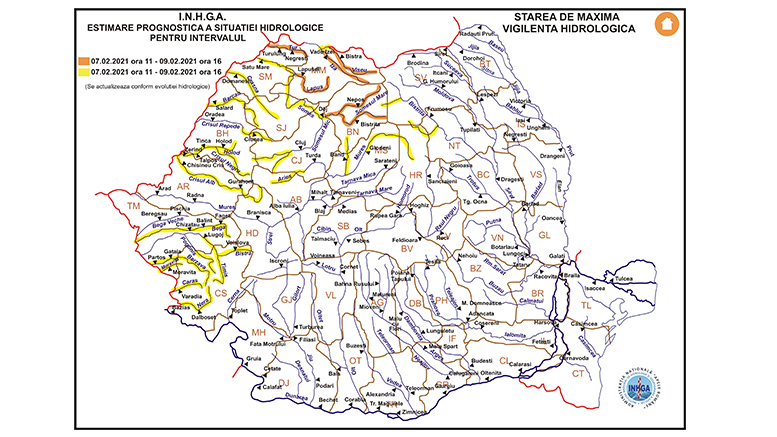 "În intervalul 07.02.2021 ora 11:00 – 09.02.2021 ora 16:00 pe râul Tur – sector aval Ac. Cӑlineşti (sector ȋndiguit - judeţul Satu Mare). În intervalul 08.02.2021 ora 16:00 – 09.02.2021 ora 16:00 pe râurile din bazinele hidrografice: Vişeu, Iza, Tur – bazin amonte Ac. Cӑlineşti şi afluenţii aferenţi sectorului aval Ac. Cӑlineşti (judeţele: Maramureş şi Satu Mare), Someşul Mare (judeţul Bistriţa Năsăud), Lăpuş (judeţul Maramureş)", se arată în avertizarea transmisă de hidrologi.