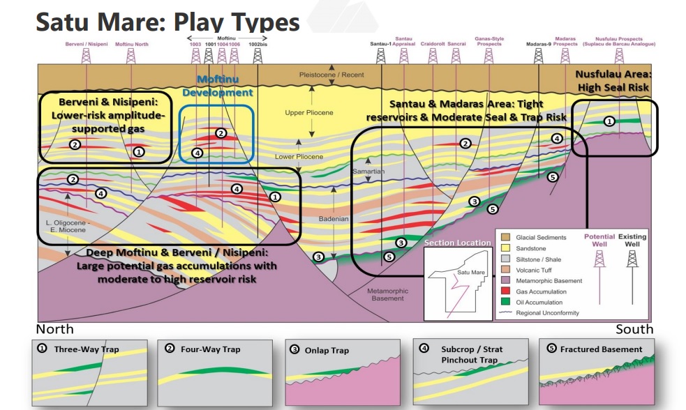 Descoperirea de la Moftin este un câmp de gaze de mică adâncime. Cinci puțuri au fost forate fără succes în jurul structurii în anii 1970, dar abia după achiziția seismică 3D în 2012 structura și rezervoarele țintă au putea fi identificate corect.