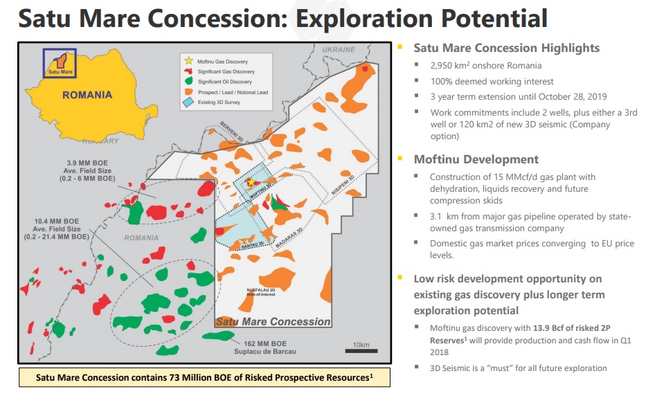 Perimetrul din Satu Mare are o suprafață de 2.949 de kilometri pătrați. Potrivit estimărilor, la sonda Moftinu-1001 forată în ultimul trimestru din 2014 au fost indentificate rezerve recuperabile în perspectivă (P50) de aproximativ 510 milioane metri cubi de gaze, echivalentul a circa 4% din consumul anual al României.
