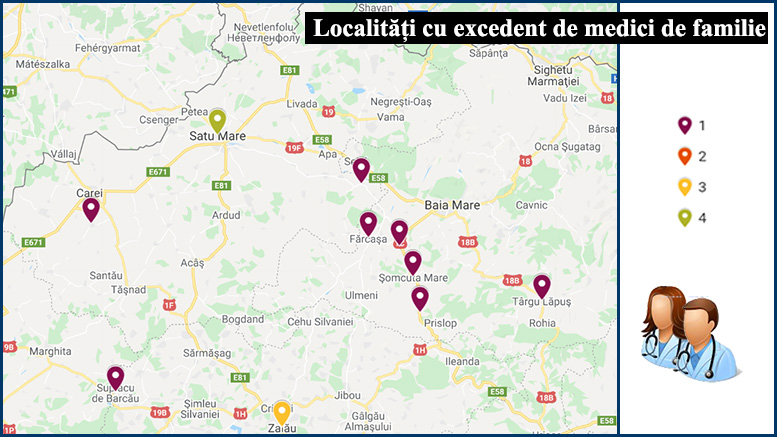 Sunt și localități care au un excedent de medici de familie. În localitățile Pomi și Tiream, fiecare are un medic în plus față de normele prevăzute prin lege, iar în municipiul Satu Mare, datele prevăd un număr de 66 de medici, dar înregistrați sunt 67 la CNAS și trei ai casei OPSNAJ, Casa Asigurărilor de Sănătate a Apărării, Ordinii Publice, Siguranței Naționale și Autorității Judecătorești.