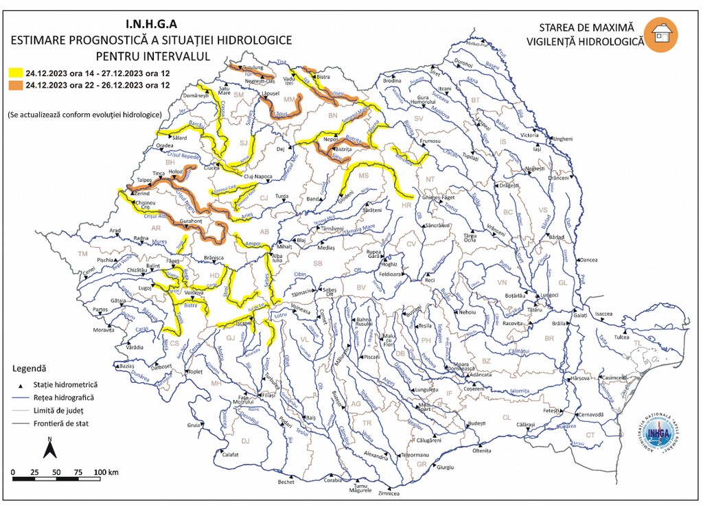 Astfel, în intervalul 24.12.2023 ora 14:00 – 27.12.2023 ora 12:00 pe râurile din bazinele hidrografice: Tur (judeţul Satu Mare), Someş – afluenţii mici aferenţi sectorului aval S.H. Dej (judeţele: Cluj, Sălaj, Maramureş şi Satu Mare), Crasna (judeţele: Sălaj şi Satu Mare) va fi în vigoare o avertizare Cod galben de inundații.