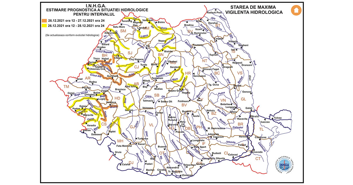 Institutul Național de Hidrologie și Gospodărire a Apelor a emis o avertizare de tip Cod galben, valabilă până pe data de 28 decembrie, pentru mai multe râuri din județul Satu Mare.
