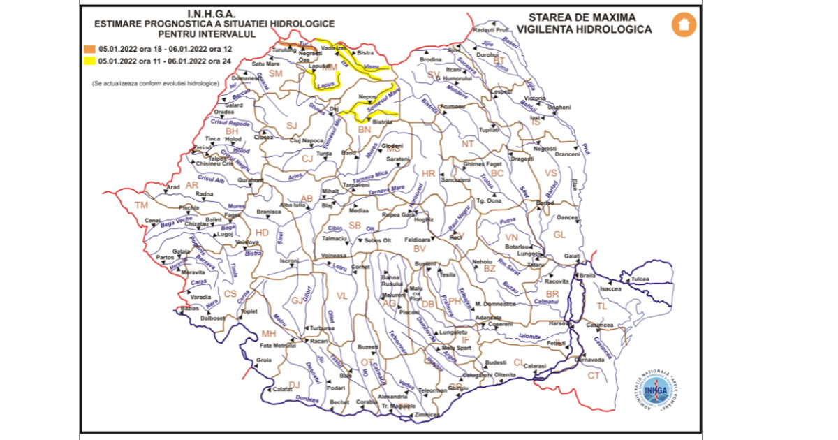 În intervalul 05.01.2022 ora 18:00 – 06.01.2022 ora 12:00 pe râurile din bazinele hidrografice: Tisa – sector aferent S.H. Valea Vişeului (județul Maramureş) şi Tur (judeţul Satu Mare) va fi în vigoare un Cod portocaliu de inundații.