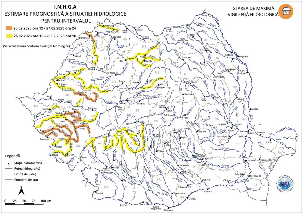 De asemenea, în intervalul 26.02.2023 ora 12:00 – 28.02.2023 ora 16:00, vor fi sub incidența Codului Galben râuri din județele: Satu Mare, Bistriţa Năsăud, Sălaj, Bihor, Arad, Hunedoara, Mureş, Alba, Timiş, Caraş Severin şi Gorj.