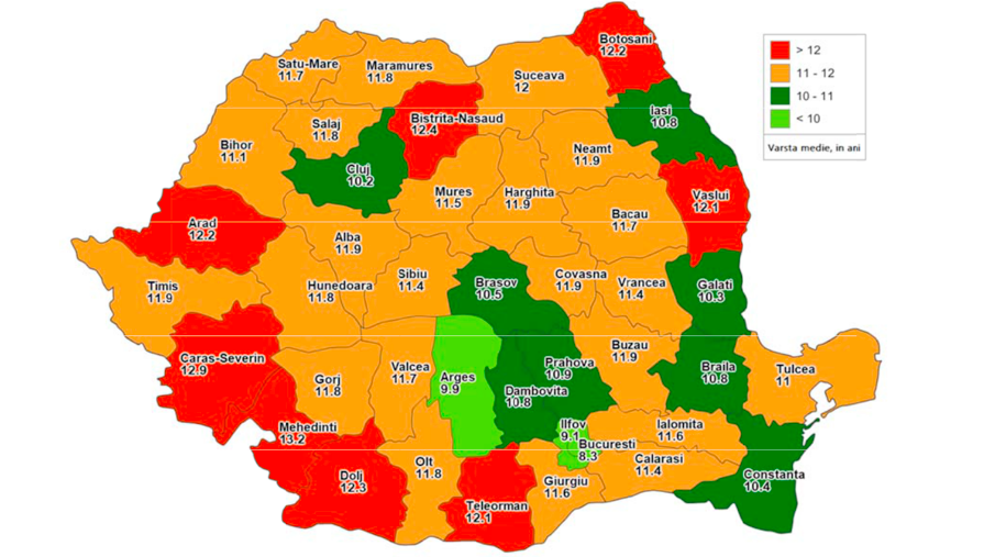 În București, Ilfov si Argeș media vârstei mașinilor este sub 10 ani. Cel mai rău stau județele Mehedinți, Caraș-Severin, Dolj, Teleorman, Arad, Bistrița-Năsăud, Botoșani și Vaslui.