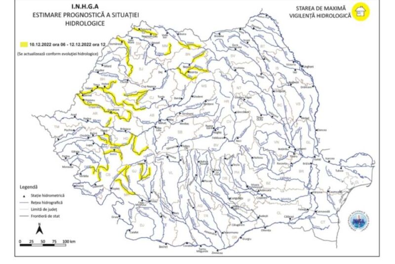 În intervalul 10.12.2022 ora 06:00 – 12.12.2022 ora 12:00 pe râurile din bazinele hidrografice: Vişeu – bazin superior şi afluenţi bazin mijlociu şi inferior, Iza – bazin superior şi afluenţi bazin mijlociu şi inferior, Lăpuş – bazin superior şi afluenţi bazin mijlociu şi inferior (judeţul Maramureş), Tur (judeţul Satu Mare), Someşul Mare – bazin superior şi afluenţi bazin mijlociu şi inferior (judeţul Bistriţa Năsăud), Someşul Mic – bazin amonte Ac. Gilău (judeţele: Bihor şi Cluj), Someş – afluenţii mici aferenţi sectorului aval S.H. Dej (judeţele: Cluj, Sălaj, Maramureş şi Satu Mare), Crasna (judeţele: Sălaj şi Satu Mare), Crişul Negru (judeţele: Bihor şi Arad), Crişul Alb (judeţele: Hunedoara şi Arad), Arieş – bazin amonte S.H. Baia de Arieş (judeţul Alba), Mureş – afluenţii aferenţi sectorului aval S.H. Gelmar (judeţele: Hunedoara şi Arad), Bega – bazin amonte S.H. Făget şi afluenţii aferenţi sectorului aval S.H. Făget – amonte S.H. Chizătău (judeţul Timiş), Timiş – bazin amonte S.H. Sadova şi afluenţii aferenţi sectorului aval S.H. Sadova – amonte S.H. Lugoj (judeţele: Caraş Severin şi Timiş), Caraş – bazin superior şi afluenţi bazin mijlociu şi inferior, Nera – bazin superior şi afluenţi bazin mijlociu şi inferior (judeţul Caraş Severin), Cerna – bazin superior şi afluenţi bazin mijlociu şi inferior (judeţele: Gorj şi Caraş Severin), Jiu – afluenţii aferenţi sectorului aval S.H. Sadu – amonte S.H. Rovinari (judeţul Gorj), Motru – bazin superior şi afluenţi bazin mijlociu şi inferior (judeţele: Gorj şi Mehedinţi).