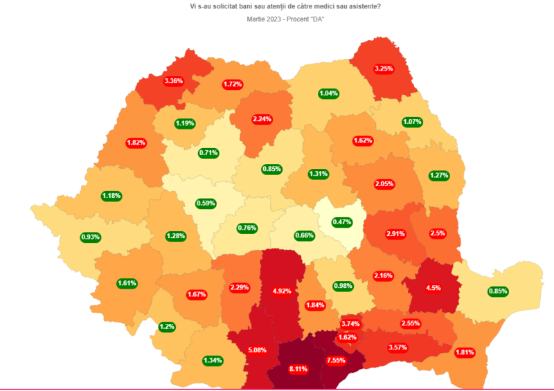 În schimb, în județele limitrofe procentul șpăgii în spitale este mult mai mic. De doar 0,71% în județul Cluj, în Bihor - 1,82%, Maramureș - 1,72%, Sălaj - 1,19%.