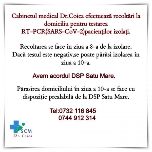 Cabinetele Medicale Dr. Coica efectuează recoltări la domiciliul pacienților aflați în izolare, cu acordul Direcției de Sănătate Publică Satu Mare. Recoltarea se face în a opta zi de la izolare, iar d...