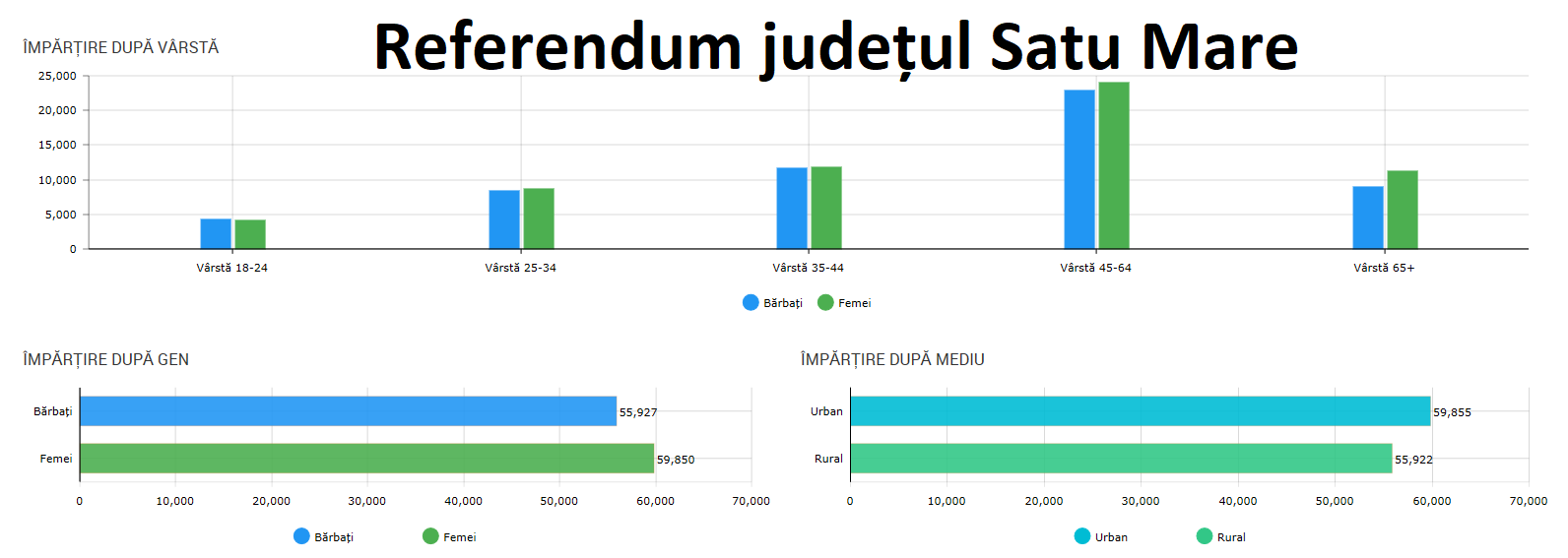 În municipiul Satu Mare, la referendum au condus detașat tot cei cu vârste cuprinse între 45 și 64 de ani. Codași au fost tinerii, cei cu vârste cuprinse între 18 și 24 de ani.