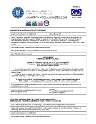 Administrația Națională de Meteorologie a actualizat informarea de vreme severă. În intervalul 27 mai, ora 12:00 - 31 mai, ora 23:00 sunt așteptate manifestări de instabilitate atomsferică.