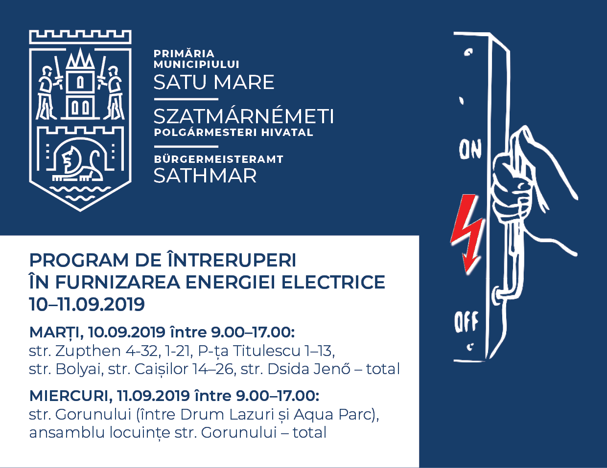Societatea de distribuție a energiei electrice anunță întreruperi programate în alimentarea cu energie electrică, în municipiul Satu Mare, după cum urmează: