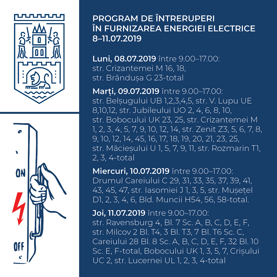 Societatea de distribuție a energiei electrice anunță întreruperi programate în alimentarea cu energie electrică, în municipiul Satu Mare, după cum urmează: