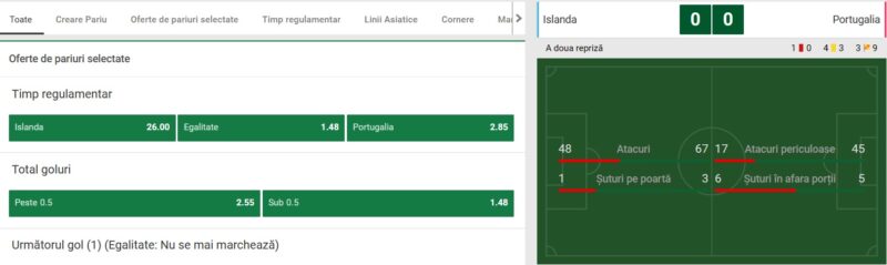 În al doilea scenariu, pariul pe selecția „peste 1.5 cornere” are valoare, mai ales că nu vorbim doar despre 5 minute până la final, ci despre minim 8 minute, pentru că mai intervin și minutele adiționale. Raționamentul este valabil și pentru „total goluri”.