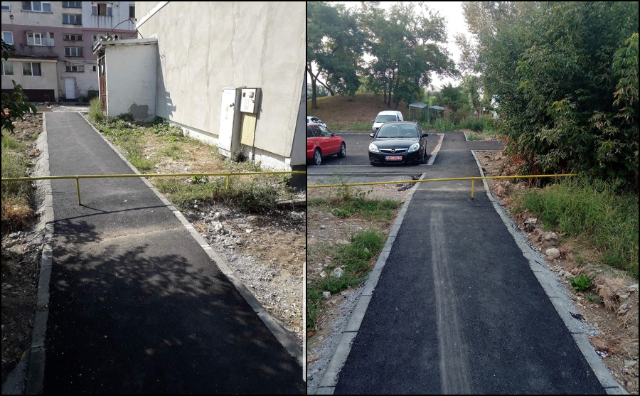 Trotuar cu obstacole într-un cartier din municipiul Satu Mare. Locuitorii din Micro 17 sunt nevoiți să sară peste țeava de gaz dacă vor să utilizeze noua alee asfaltată.