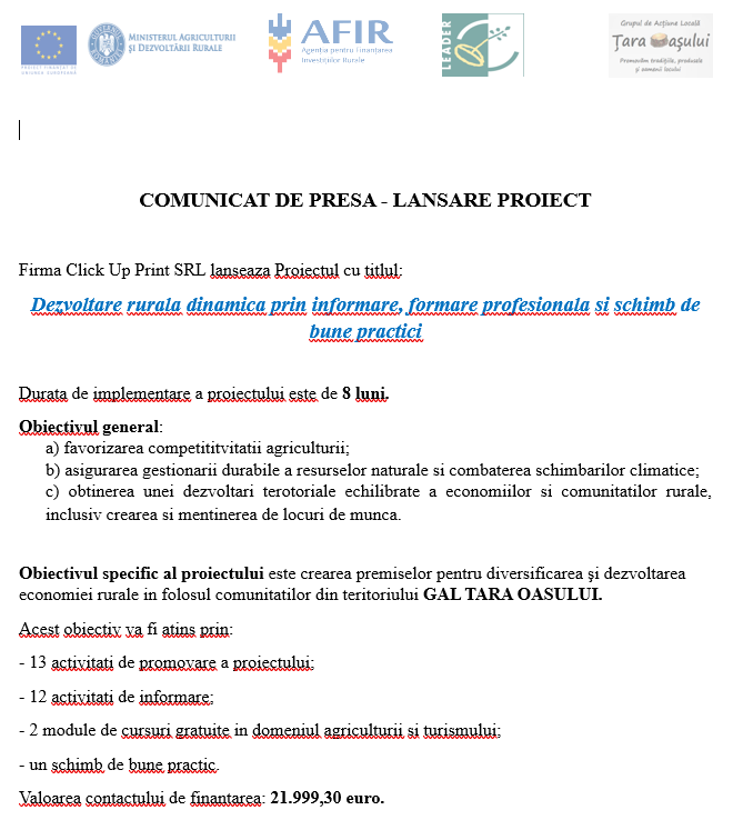 Lansare proiect Click Up Print SRL - Dezvoltare rurală dinamică prin informare, formare profesională și schimb de bune practici