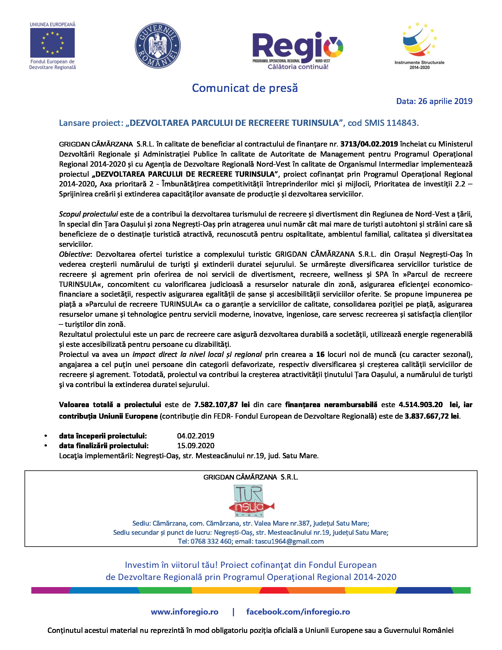 Lansare proiect: „DEZVOLTAREA PARCULUI DE RECREERE TURINSULA”, cod SMIS 114843