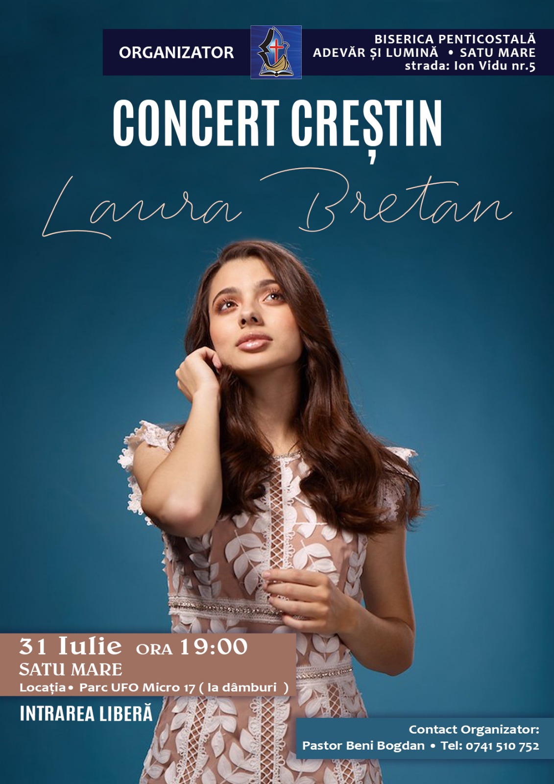 Laura Bretan, tânăra cu origini sătmărene care a făcut senzație la "Românii au talent" și la "America's Got Talent" revine la Satu Mare pentru un concert cu muzică tematică. Laura va fi prezentă pe 31 iunie, în parcul UFO din cartierul Micro 17, de la 19:00, iar intrarea la eveniment este liberă.